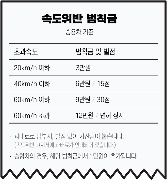 도로교통법에 따르면 속도위반 범칙금은 초과 속도에 따라 그 범칙금과 벌점이 달라집니다.