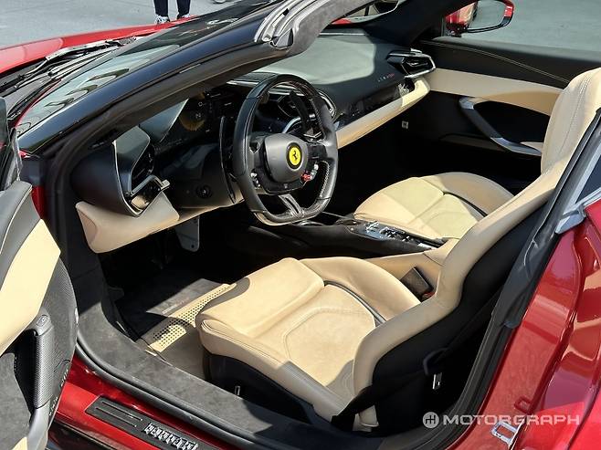 먼저 하늘색 리버리가 더해진 296에 올랐다. 동승한 인스트럭터는 "트랙 주행을 위한 경량화 패키지 '아세토 피오라노'가 적용됐다"라며 "그렇다 보니 실내 대부분이 카본으로 뒤덮였다"고 설명했다. 시트부터 도어트림과 스티어링 컬럼, 센터페시아까지 수많은 곳에 리얼카본이 가득하다. 슬쩍 무늬만 넣는 행위는 페라리에선 있을수 없는 일이다.