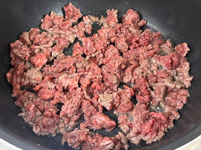 카레에 절대 빠질 수 없는 것이 소고기입니다. 다른 재료 다 생략하더라도 소고기는 꼭 넣어야 맛이 삽니다. 고기는 부드럽고 연한 부위로 다짐육으로 준비합니다. 중 약불에 먼저 볶아 기름을 냅니다.