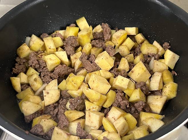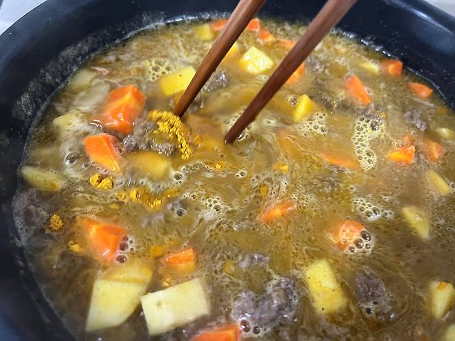 소고기와 딱딱한 고구마, 당근, 감자 등을 넣고 3~4분 볶다가 물을 넣어 주세요. 재료가 거의 잠길 만큼 넣습니다. 그리고 카레 가루 1봉을 풀어주세요.
