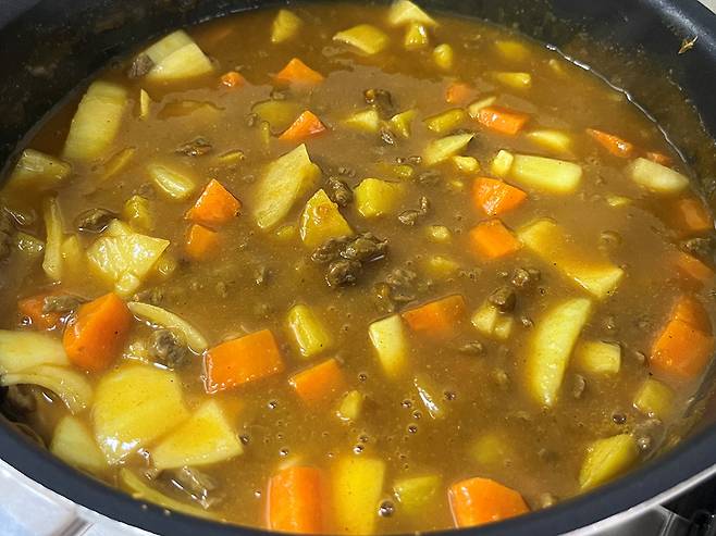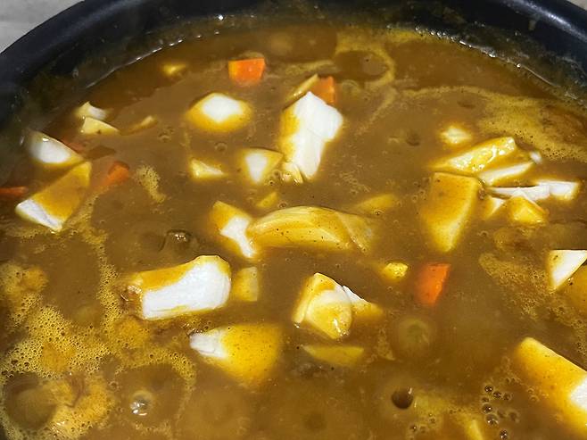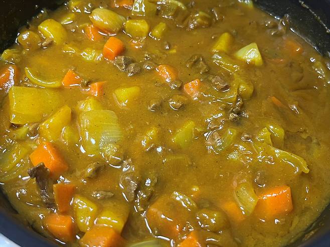카레의 농도가 되직하게 졸아들면 불을 끄세요. 카레의 전분 성분은 불을 끈 뒤에도 잔열에 의해 계속해서 졸아들기 때문에 내가 원하는 농도보다 살짝 묽다고 느껴질 때 불을 꺼야 합니다.