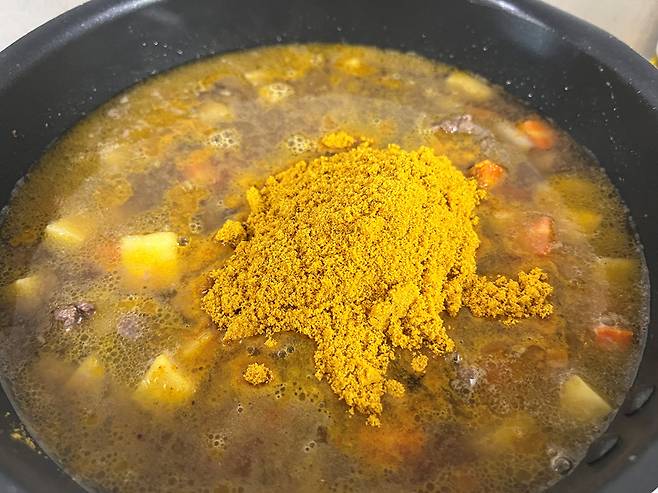 카레가루는 물 붓고 바로 넣지 마시고, 물을 살짝 끓인 후 넣어 주세요. 그래야 덩어리가 생기지 않고 고르게 잘 풀어집니다. 또한 끓는 시점에 넣으면 카레 특유의 깊고 진한 맛을 온전히 보존할 수 있습니다.
