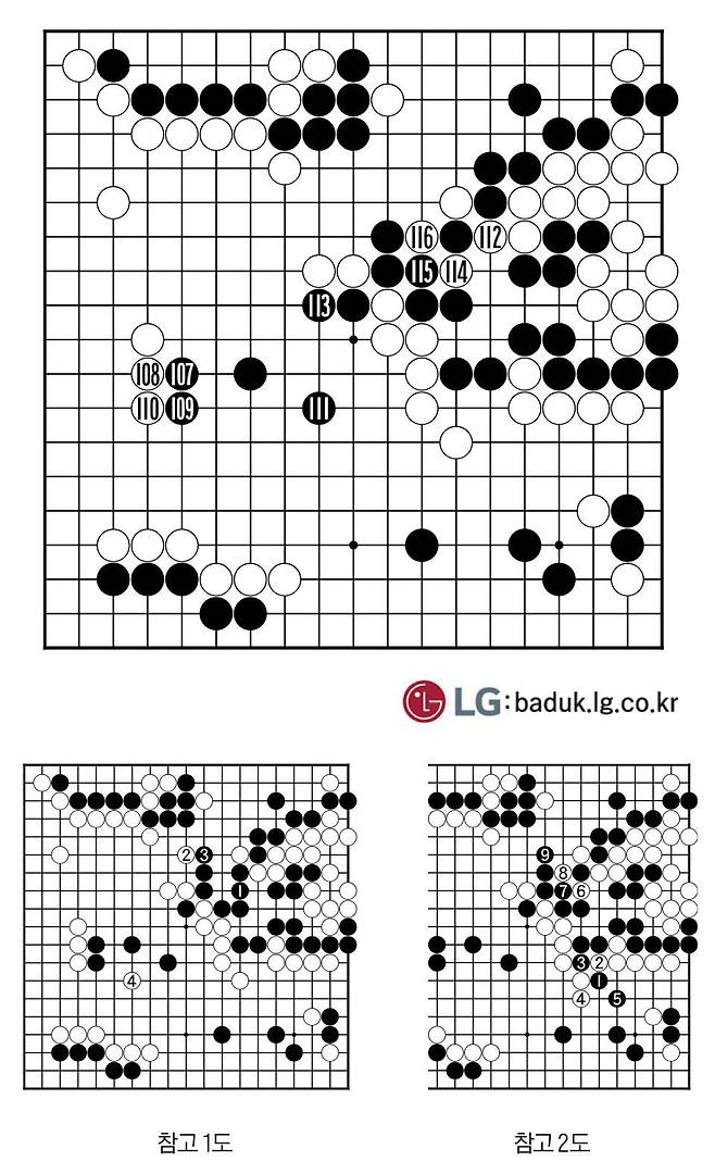 107, 109는 어깨를 짚어 타개하는 상투적 수법. 여기서 신민준은 112로 미묘한 곳을 찔러 갔다. 응수하기가 까다로운 장면에서 113으로 밀어간 쉬하오훙. ‘공격이 최선의 방어’라는 생각이다. 참고 1도 1로 받으면 2가 절대 선수. 백이 이곳 약점을 선수로 보강한 후 4 정도로 공격하면 의도한 대로 주도권을 쥐게 된다.