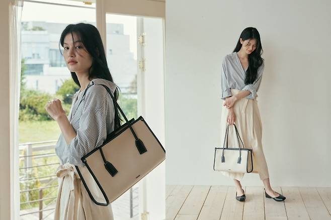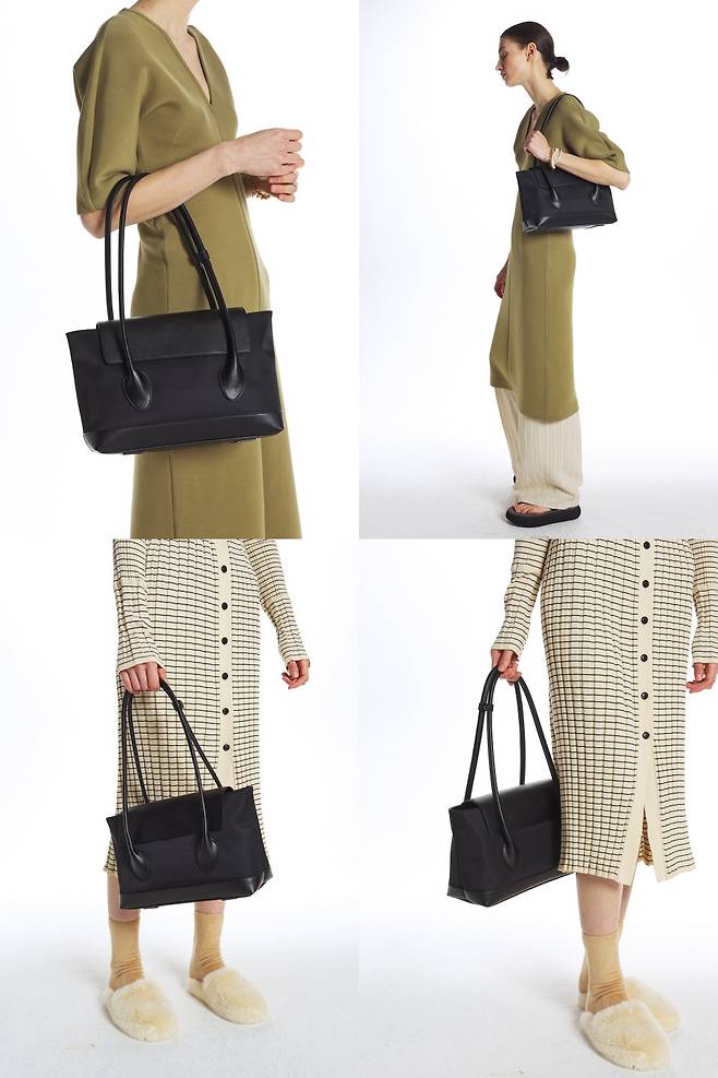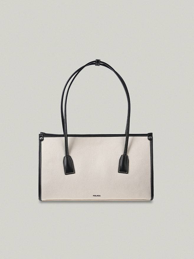 차분한 캔버스 소재의 가방입니다. 옆으로 긴 직사각형 모양으로 수납력이 좋아요. 심플한 디자인이지만 디테일이 상당히 뛰어납니다. 블랙 가죽 스티치 장식, 스트랩 고정 고리, 상단의 징 장식 등 승마용품을 떠올리게 하는 고급스러움이 있어요. 가로 사이즈가 35cm로 넉넉해 노트북이나 서류는 가볍게 들어갑니다. 안쪽 주머니와 사이드 포켓도 달려 있어요. 하얀 가방이다 보니 아무래도 오염이 걱정되긴 하죠. 다행히 바닥에 징이 4개 박혀 있어 내려놓아도 캔버스에 때가 타진 않게 했어요. 평소 하늘하늘한 블라우스를 즐겨 입는 분들에게 추천합니다.