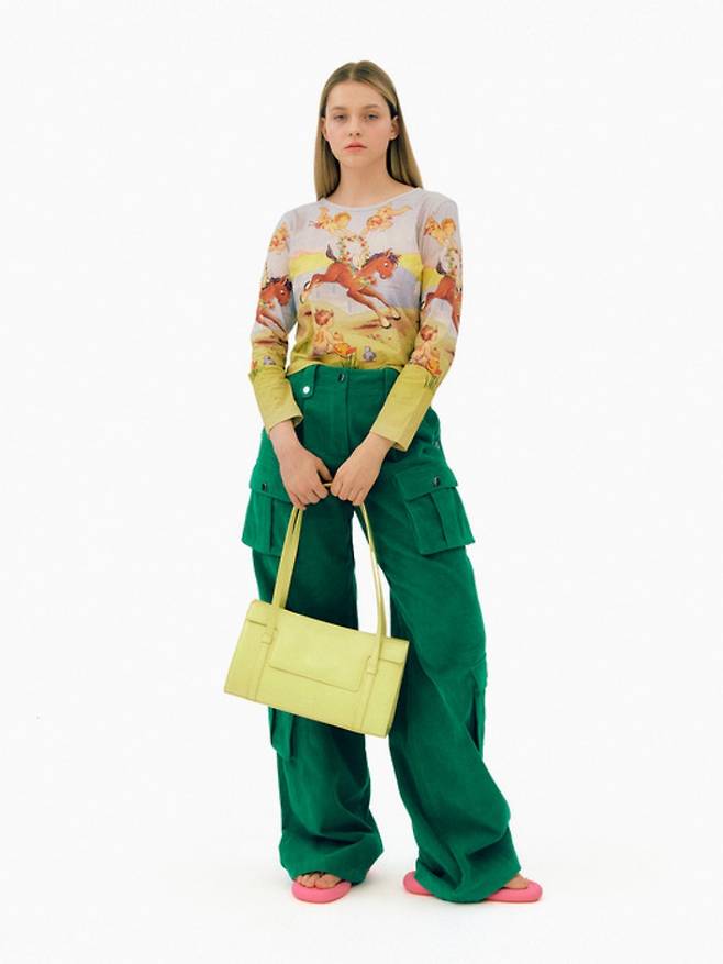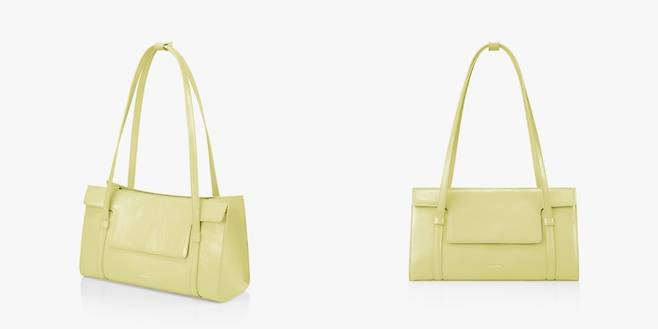 이번엔 아주 상큼한 컬러의 가방입니다. 레몬버터색이 도는 라임 컬러인데요, 블랙, 브라운, 화이트, 아이보리 등의 기본적인 컬러들도 있는데 지금은 아이보리와 브라운 컬러만 남아있네요. 보기에는 크지 않은 것 같은데 바닥이 넓은 형태의 가방이라 수납력이 아주 좋은 편이에요. 서류나 노트북을 넣으면 조금 위로 올라오긴 하지만 가방이 더 커지는 것보단 이 정도가 귀여운 것 같아요. 가방 입구를 플립으로 여닫을 수 있는데 플립을 열면 바로 나오는 포켓에 자주 쓰는 물건들을 넣어둘 수 있어요. 이 가방 역시 비건 레더 소재로 무게는 스탠드오일의 오블롱백보다 조금 더 가볍습니다. 무채색 옷에 포인트로 메기 아주 좋아요.