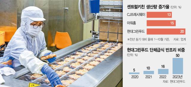 1일 식품업계에 따르면 올해 들어 10월까지 CJ프레시웨이 경기도 이천 센트럴키친의 생산량은 전년 동기 대비 13% 증가했다. 제조 품목도 올해 250가지로 1년 만에 47%가량 늘었다. 같은 기간 아워홈과 현대그린푸드는 각각 경기 안산과 성남에 둔 센트럴키친에서 반조리 메뉴 생산을 15%, 20% 확장했다. 이전까지 자체 시설 없이 협력업체를 활용했던 삼성웰스토리도 11월 충남 아산에 2만354㎡(6157평)규모로 센트럴키친을 준공하고 샌드위치류부터 본생산에 들어갔다.