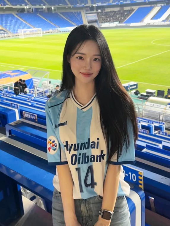 박예린은 남편 이동경이 속한 울산 현대의 유니폼을 데님 팬츠와 매치해 블록코어 스타일을 연출했다.
