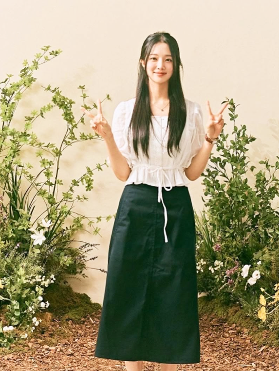 박예린은 롱스커트와 화이트 블라우스를 조합해 청순하면서도 우아한 분위기를 연출했다.