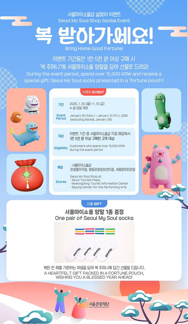 2025년 설날을 맞아 서울관광재단(대표이사 길기연)은 1월 20일부터 31일까지 서울마이소울샵 전 매장에서 ‘설맞이 구매 사은 이벤트’를 진행한다고 밝혔다. 이번 이벤트는 서울을 찾은 내·외국인에게 새해 '복'을 전하고, 재밌고 다양한 쇼핑 경험을 제공하기 위해 기획됐다고 전했다.