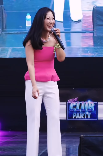 김현정은 핑크색 탱크탑을 입고 시원하면서 포인트를 주는 스타일을 선보였습니다. 탱크탑의 핑크색은 그녀의 밝고 러블리한 이미지를 강조하며, 플레어 형태의 아랫단은 더욱 러블리한 무드를 더했습니다. 하의로는 화이트 팬츠를 매치해 깔끔하고 여유 있는 룩을 완성했습니다.
