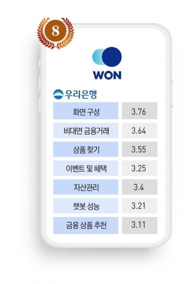 2015년 5월 한국 최초로 모바일뱅킹 앱(위비뱅크)을 선보인 우리은행은 꼴찌를 기록했다. ‘우리원(WON)뱅킹’의 총점은 3.41점으로 1위와 비교해 0.61점 차이가 났다. 7개 부문 모두 가장 낮은 점수를 받은 탓이다. ‘복잡한 메뉴 구성으로 서비스를 찾기 어렵다’는 지적이 많았다.