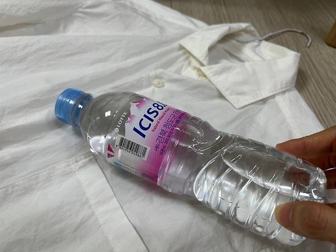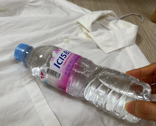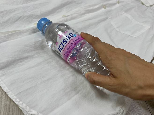 페트병 뚜껑을 꽉 닫아 물이 새지 않도록 합니다. 페트병을 옷 위에 두고 눕힌 상태로 지그시 힘들 주어 원단을 문지릅니다.