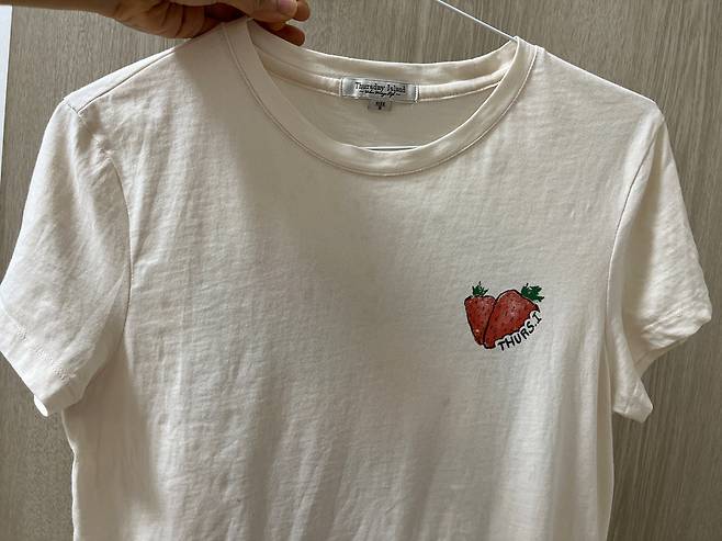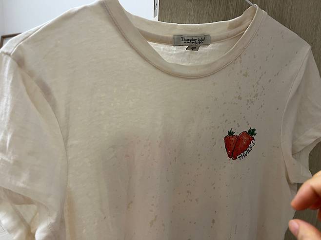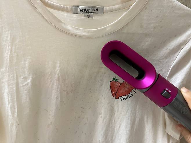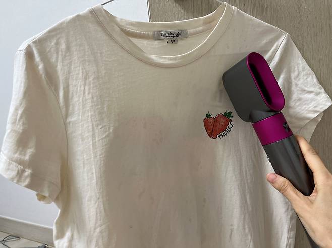 그다음 티셔츠를 아래쪽을 당겨 판판하게 만든 후 드라이기 열을 가해 보세요. 심했던 주름이 조금씩 없어집니다.