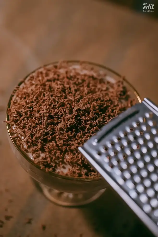 8) 살짝 얼린 초콜릿을 곱게 갈아 올린다.