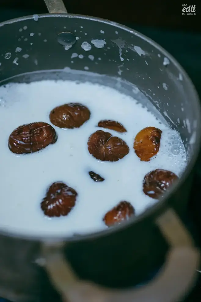 1)맛밤을 우유에 살짝 끓인다. 눌러보았을 때 적당히 으깨질 때까지 끓였다.