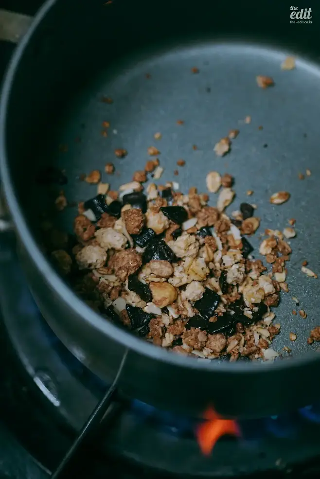 5) 초코그래놀라를 볶아준다. 이때, 초콜릿은 타기 쉬우니 따로 빼두는 것도 방법.