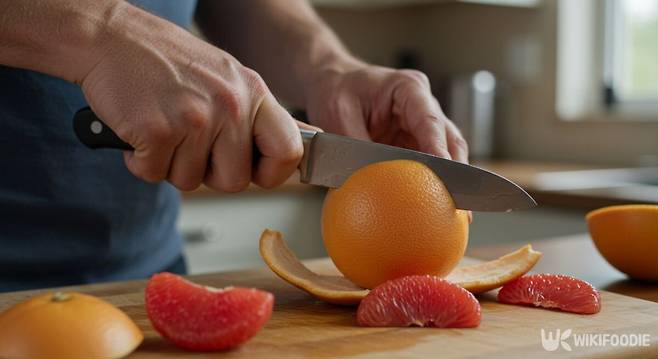 자몽 손질은 간단하면서도 약간의 요령이 필요하다. 먼저 칼로 겉껍질을 얇게 깎아낸다.