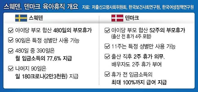 고용 형태와 사업장, 노조와의 단체협약 등에 따라 다르지만 덴마크는 휴직 전 소득의 80∼100%를 육아휴직 기간 지급한다. 덴마크도 최근 노동력 부족을 겪고 있어 기업이 인재 유치를 위해 경쟁적으로 관대한 가족 복지 혜택을 제공하고 있다. 이에 따라 소득 100%를 보전받으면서 유연하게 육아휴직을 쓸 수 있는 회사도 적지 않다.