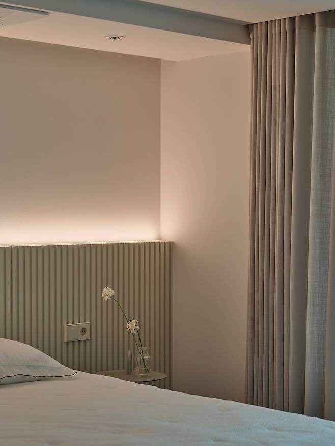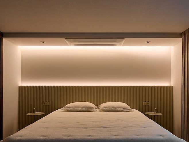침대를 두는 쪽 벽면은 템파 보드를 붙이고 간접 조명을 설치했습니다. 그리고 침대는 별도의 프레임 없이 파운데이션을 제작해 그 위에 매트리스를 올렸는데요, 아내가 워낙 높은 서양식(?) 침대를 선호해서 파운데이션 높이를 매우 높게 제작했습니다.