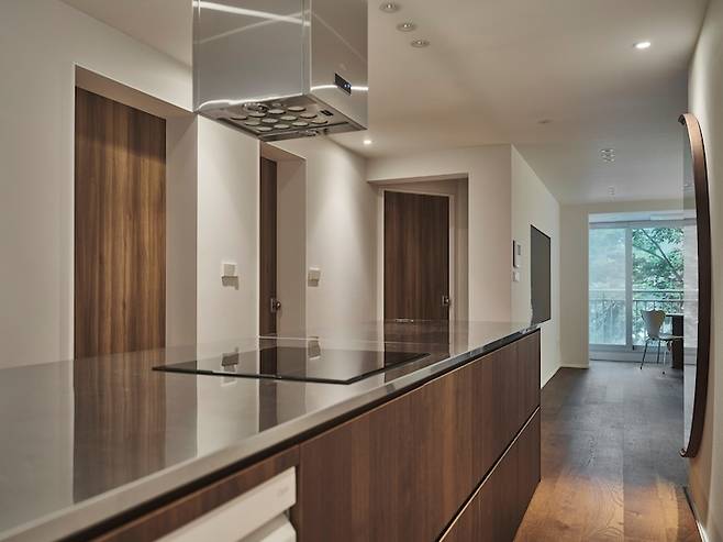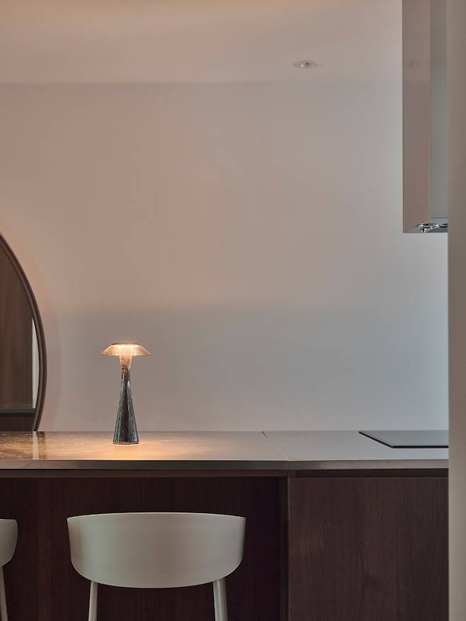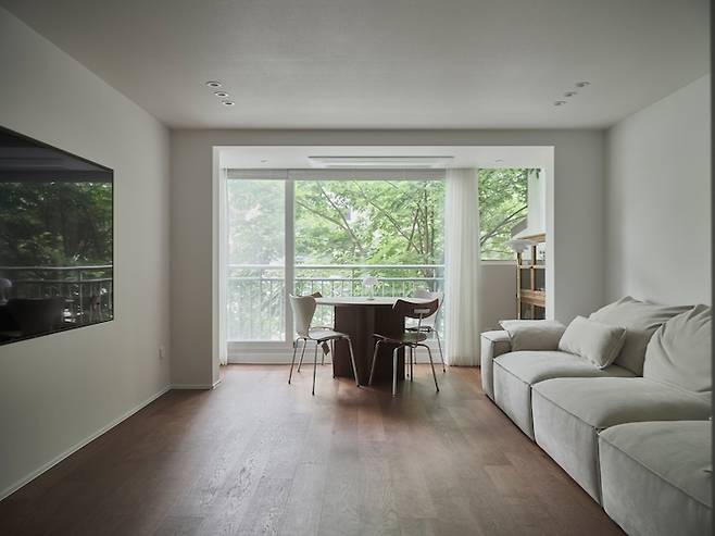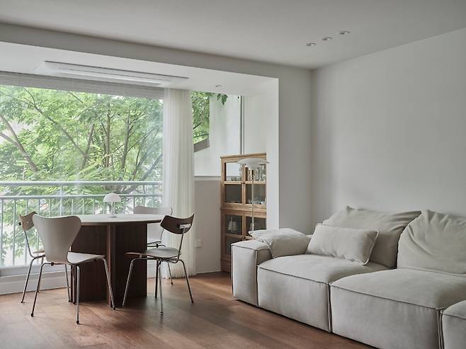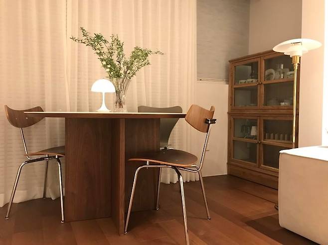 이 사진에서는 식탁과 의자가 좀 더 잘 보이는데요, 식탁의 상판은 세라믹으로 하부는 우드로 구성된 바이리네의 제품이고 의자는 프리츠한센의 세븐 체어 2개와 브리티시 체어 2개로 골랐습니다. 주말마다 사계절의 모습이 한눈에 들어오는 풍경 앞에 앉아 아내와 맛있는 음식을 먹을 때마다 정말 행복합니다.