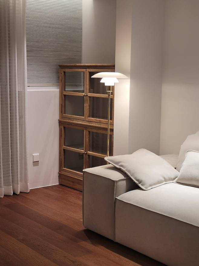 그리고 집안 무드에 큰 몫을 담당하는 커튼과 블라인드는 위치에 따라 모두 달리했습니다. 수납장 위로는 허니콤을, 확장면으로는 흰색 우드 블라인드와 커튼을 함께 설치했어요. 각 공간의 무드에 맞춰 형태/소재/색상을 다르게 했고 이후 나올 서재는 블라인드 폭이 훨씬 작은 알루미늄 소재로 달았습니다.