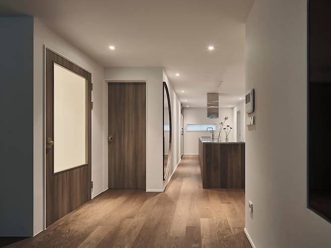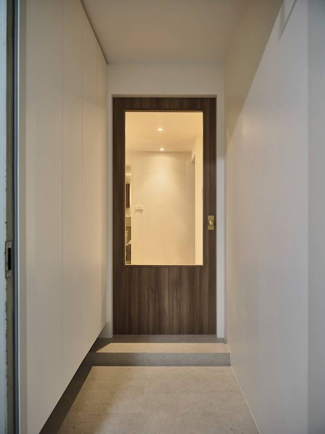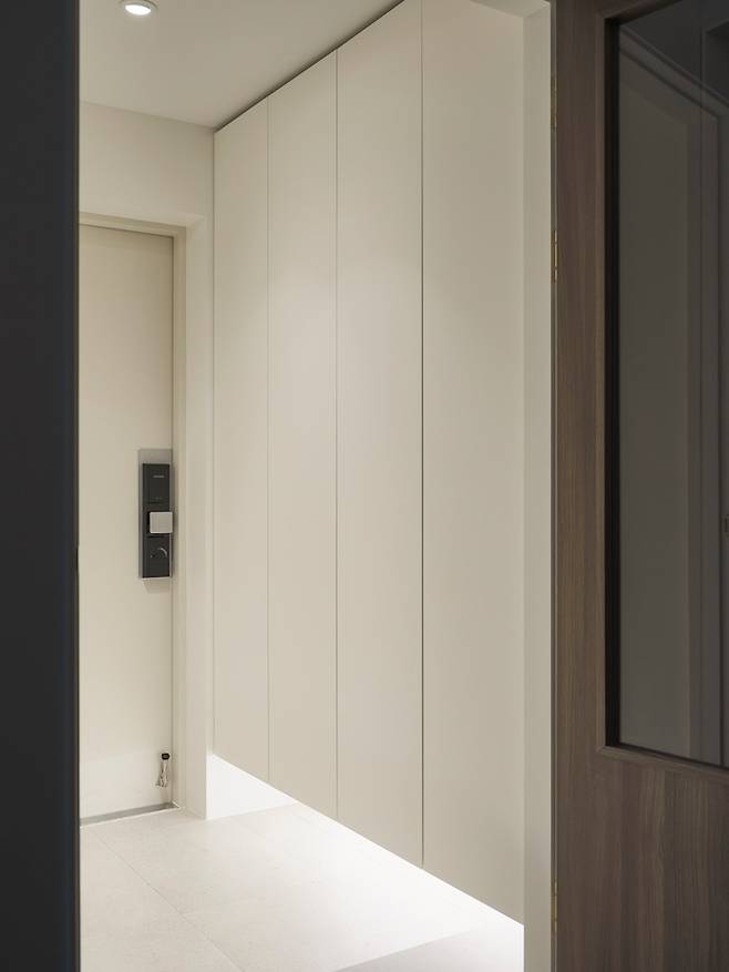 현관은 심플 그 자체인데요, 처음 디자인을 고민할 때만 해도 신발장 중간의 공간을 비워 사진이나 차 키를 두는 인테리어 소품을 두어볼까 했지만 저희의 핵심 테마인 #깔끔을 고려해 하부를 띄우되 전면을 신발장으로 구성했습니다.