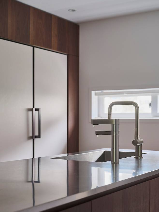 아일랜드장의 기본 소재는 우드이고, 상부는 스틸을 선택했어요! 스틸은 '바이브레이션'으로 유광의 반짝이는 일반 스테인리스와 달리 붓칠 작업을 통해 무광에 미세 무늬가 있는 소재로 주방의 멋스러움을 한껏 더했습니다.