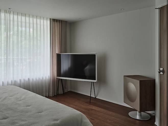 그리고 침대 맞은편에는 제가 사용하던 세리프 TV와 음악을 좋아하는 아내를 위한 제네바 스피커가 각각 자리 잡고 있습니다. 하지만, 얼마 전 세리프 TV를 정리하고 그 자리에 LG오브제 공기청정기를 두었는데요, 고양이 세 마리와 함께 하는 침실이다보니 펫 모드로 운행해 최대한 쾌적한 안방 환경을 만들었습니다.
