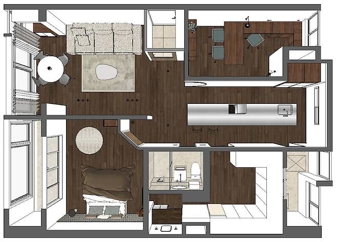 특히, 거실의 베란다는 내력벽으로 인해 완전히 개방하기 어려웠고 주방은 기존의 창문 위치를 감안해야 하다보니 기존과 크게 다르지 않은 'ㄱ' 형태로 가야 하지 않을까 생각했어요.