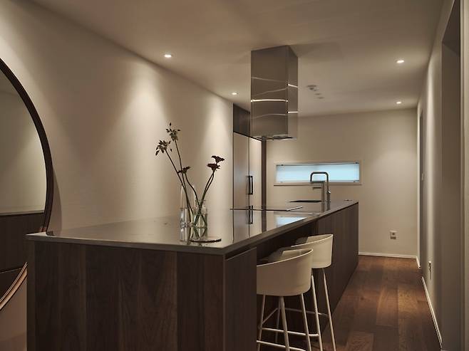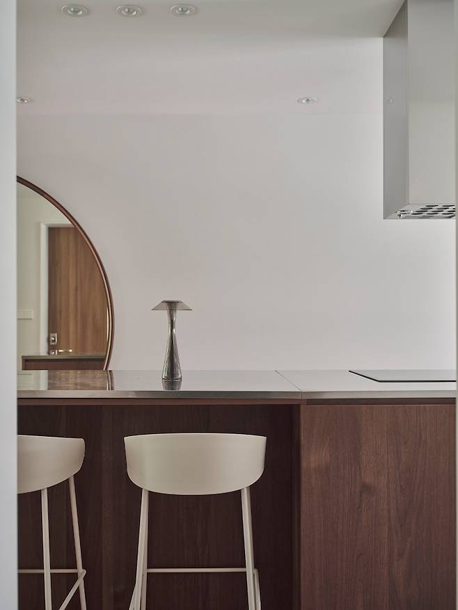 워낙 주방 아일랜드장이 길게 기획되어 바 체어를 놓는 공간도 생겼습니다. 둘이 간단히 식사하거나 분위기 있게 와인을 마실 때를 대비해서 아일랜드장의 한쪽 끝에는 바 테이블을 만들었는데, 그 옆 인덕션에서 간간히 요리하며 아내에게 바로 음식을 건내주며 테판 다이닝의 느낌을 내기도 합니다^^