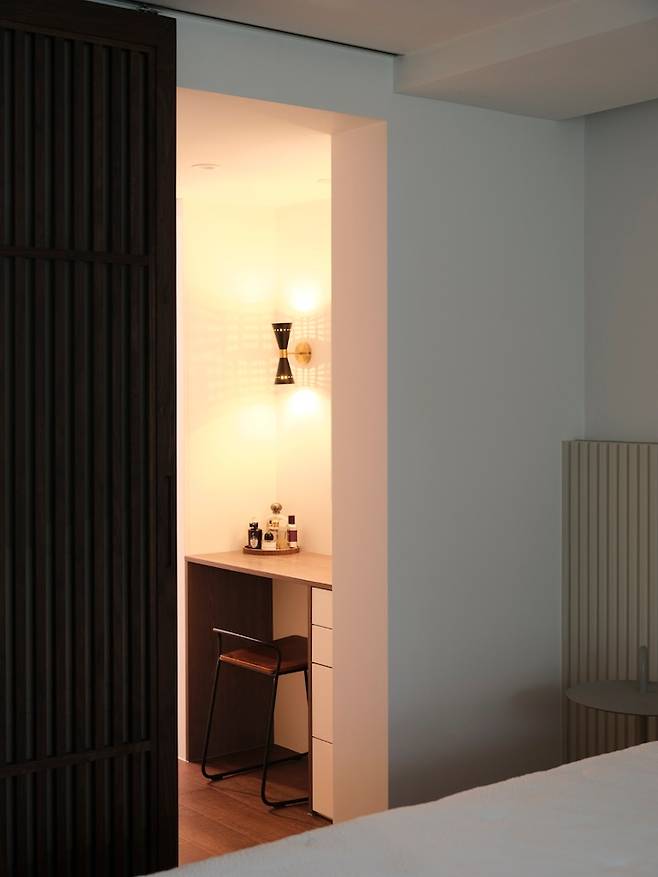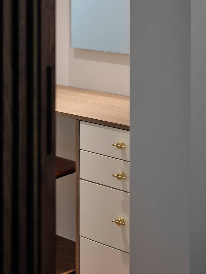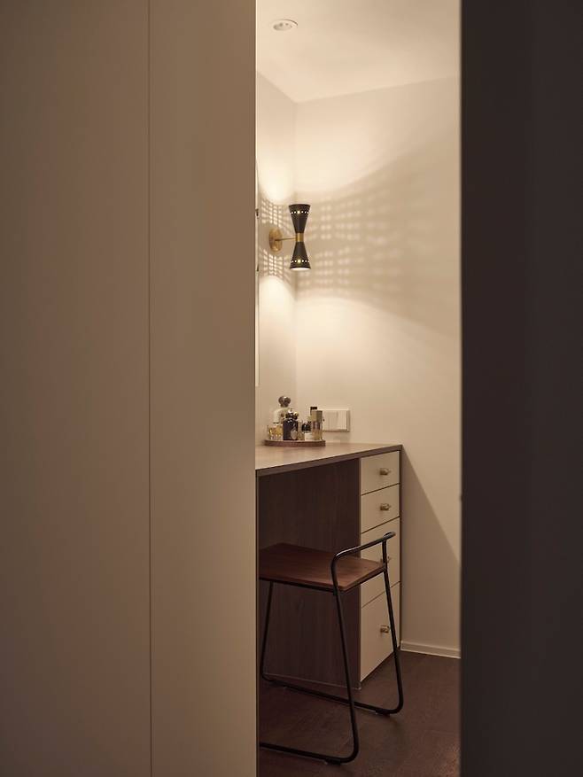 슬라이딩 형태로 간살문을 설치해 공간을 구분하기로 했고 화장대를 설치하고 벽 중앙에 거울을, 그리고 거울 양쪽으로는 벽 조명을 달았어요. 화장대는 공간 크기에 맞게 제작했고 전반적으로 우드(화장대 상판과 옆면, 의자), 화이트(서랍장), 블랙(벽 조명, 의자 다리), 골드색(벽 조명, 서랍장 손잡이)을 주로 사용했어요.