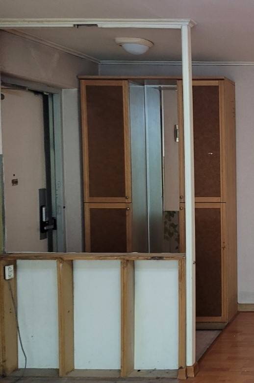 우선 이전 현관을 보면 1) 신발장의 수납 공간이 적고, 2) 거실과 구분해주는 허리 높이의 애매한 분리벽과, 3) 중문이 없는 형태였습니다. 이 세 가지는 모두 필수적으로 보완 및 변경되어야 하는 점이기에 아래와 같이 바꿨어요!
