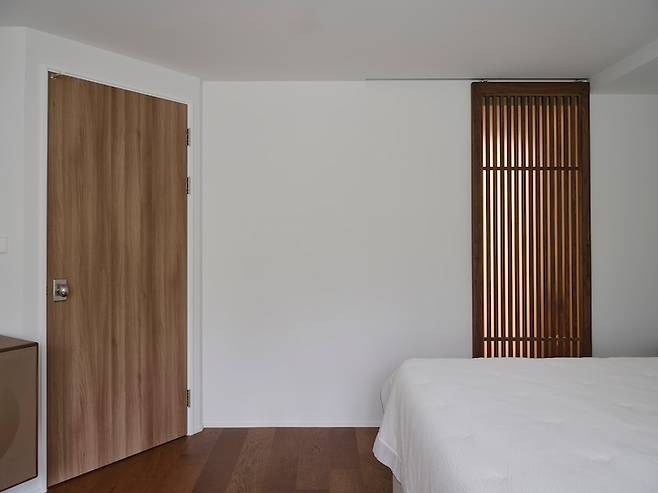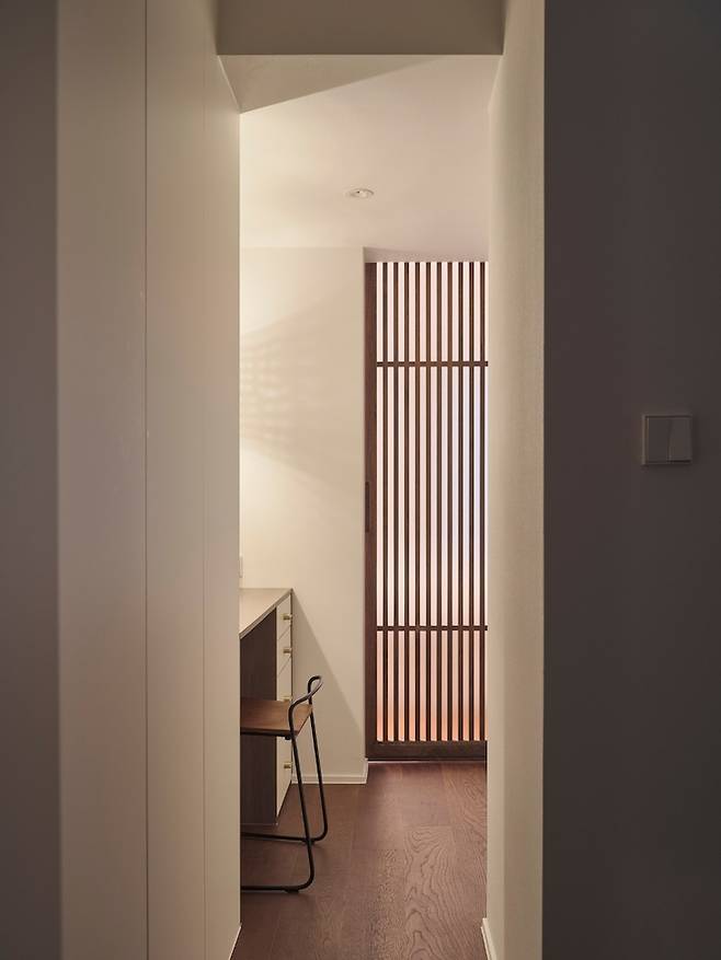 그리고 화장대와 드레스룸을 소개할 때 보셨던 익숙한 간살문이 안방 안쪽 벽면에 설치되어 있습니다. 아, 안방 방문은 사선으로 열리는 모양인데요, 자세히 소개해드리겠습니다.