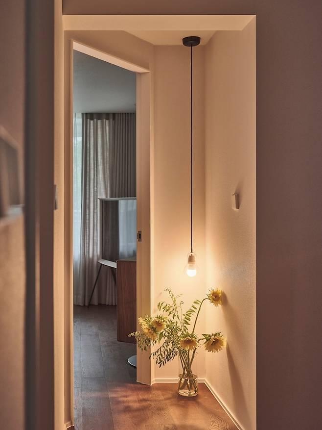 그리고 가끔 아내가 화병을 펜던트 조명 밑에 두기도 합니다.