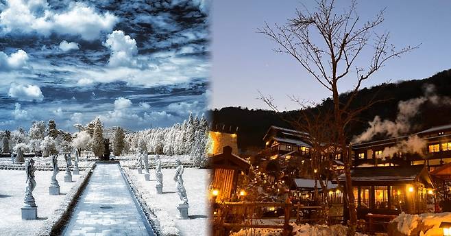 한겨울 눈이 내리면 니지모리 스튜디오 전체에 소복히 쌓인 눈이 더 깊은 분위기를 연출하곤 하는데요. 각종 일본 먹거리, 기념품을 판매하고 일본 전통 숙박 시설인 료칸까지 운영하고 있어 당일치기는 물론 1박 2일 이국적인 여행지로 적합합니다.