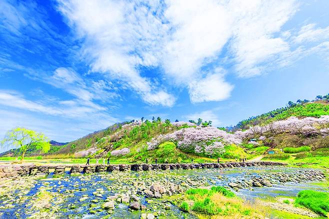 28개의 돌다리 기둥이 이어져 만들어진 이 다리는 하천을 가로지르며, 특히 겨울철에는 하얀 눈이 덮여 고즈넉한 풍경을 연출합니다.