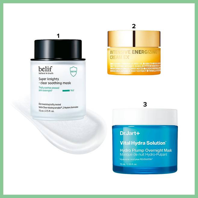 3 닥터자르트 바이탈 하이드라 솔루션 하이드로 플럼프 오버나이트 마스크 거칠고 푸석한 피부를 촉촉하고 매끄럽게 가꿔 수분 가득한 피부로 만들어줄 탱글한 푸딩 텍스처의 나이트 마스크. 75ml 3만6000원.