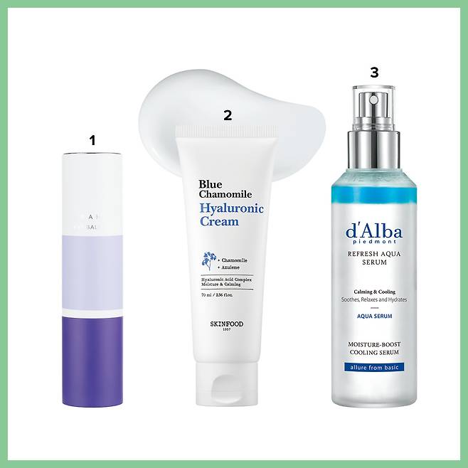 2 스킨푸드 블루 캐모마일 히알루로닉 크림 캐모마일, 아줄렌, 히알루론산 3가지로 완성한 ‘블루 수분 장벽’ 성분으로, 피부의 수분 장벽을 강화하고 콜라겐 합성을 촉진해 탄력을 증가시킨다. 70ml 2만5000원.