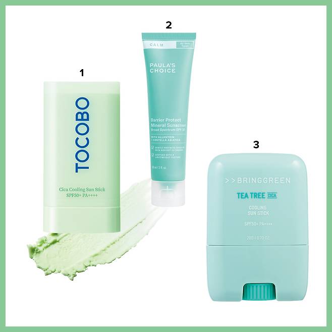 3 브링그린 티트리 시카 쿨링 선스틱 SPF50+/PA++++ 선스틱을 피부에 도포할 때 느껴지는 수분감이 기체로 증발하는 과정에서 주변의 열을 흡수해 함께 날려 자연스럽고 편안한 쿨링감과 진정 효과를 선사한다. 20g 2만원.