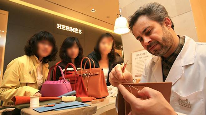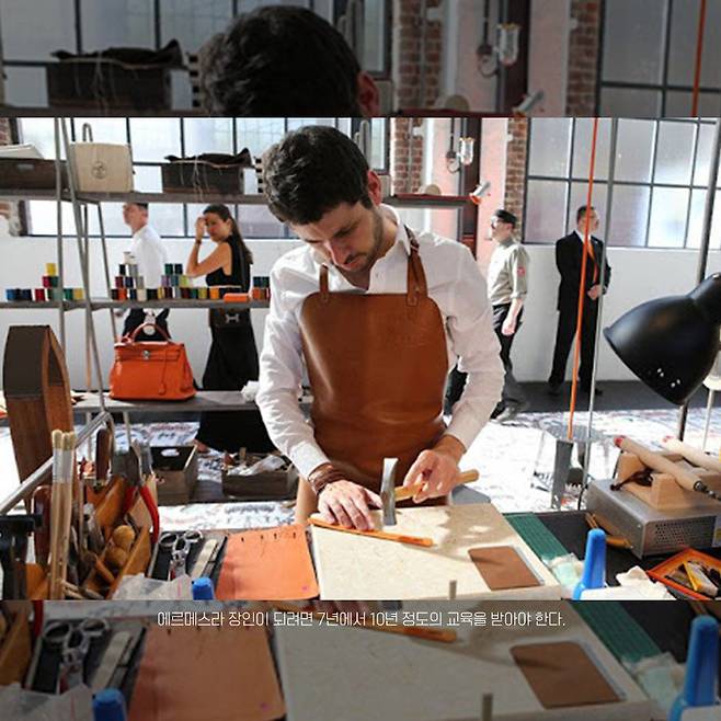 에르메스 백은 장인이 처음부터 끝까지 혼자 박음질하여 제작된다. 미싱이나 기계도 쓰지 않고 분업 또한 없다. 에르메스의 장인이 되기 위해서는 3년 동안 에르메스 학교를 다녀야 하는데, 그 후 2년의 수련과정을 거치고 2년 이상의 경력이 더해진다. 총 7년에서 10년 정도의 교육을 받는 셈이다.