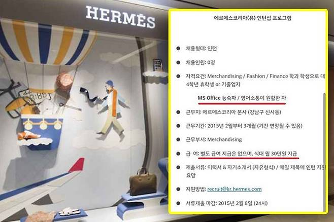2015년 열정페이 논란도 있었다. 영어 가능한 인턴을 뽑는다면서 급여는 식대 30만 원이라는 채용 공고문 때문이었다. 에르메스 코리아는 자사의 인턴십 프로그램에 참여할 경제, 경영, 회계 전공자를 찾는다면서 컴퓨터 활용과 영어 소통 능력을 채용 기준으로 제시했다. 별도의 급여 지급은 없었다.