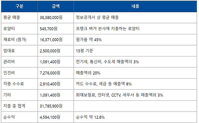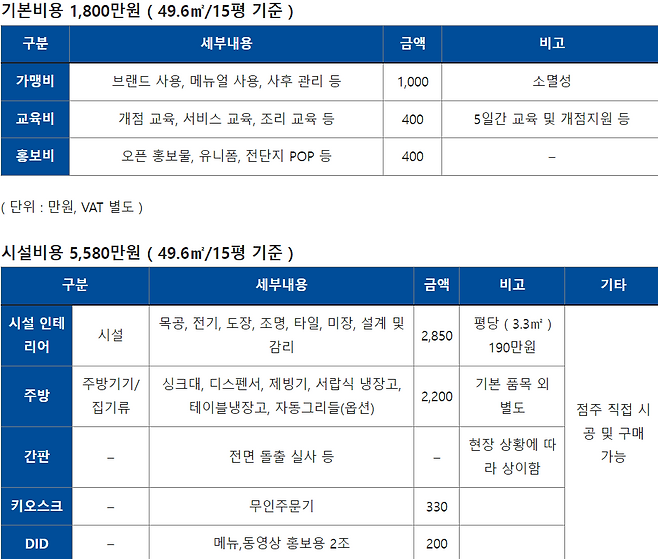 - 점포 투자 비용은 규모와 특성에 따라 달라질 수 있으며 부가세는 별도입니다.