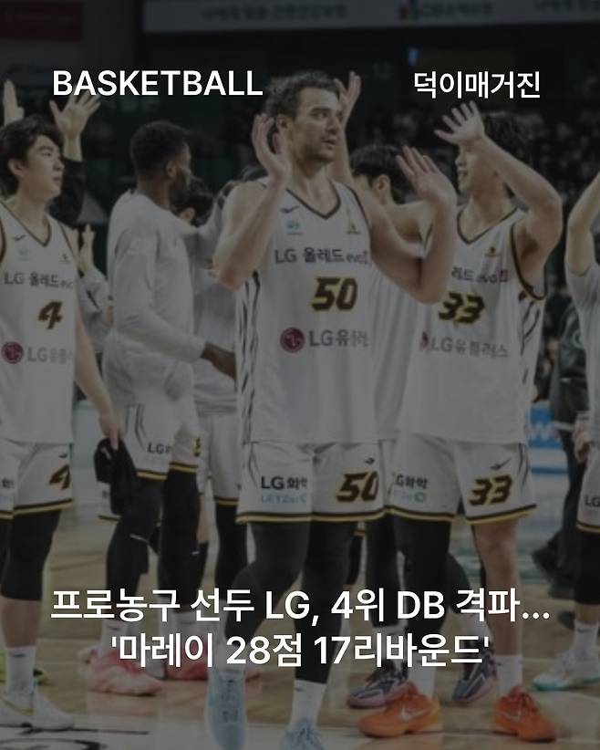 4쿼터에도 마찬가지 흐름이 이어졌습니다. LG는 DB의 추격을 적절히 막아내며 꾸준히 리드를 지켰습니다. LG는 쿼터 막판 마레이의 골밑 공략으로 차이를 벌렸습니다. 마지막까지 리드를 이어간 LG가 승리를 따냈습니다. 마레이는 28점 17리바운드로 더블 더블을 기록했고 어시스트도 5개를 곁들였습니다. 3점 3개씩을 넣은 유기상(15점)과 양준석(11점)의 활약도 빛났습니다. 한편, LG는 약 10일간의 휴식기를 갖는다. 조상현 감독은 “이번 브레이크 때 훈련량으로 지옥을 맛보게 해주겠다”라며 강도 높은 훈련을 예고했습니다.