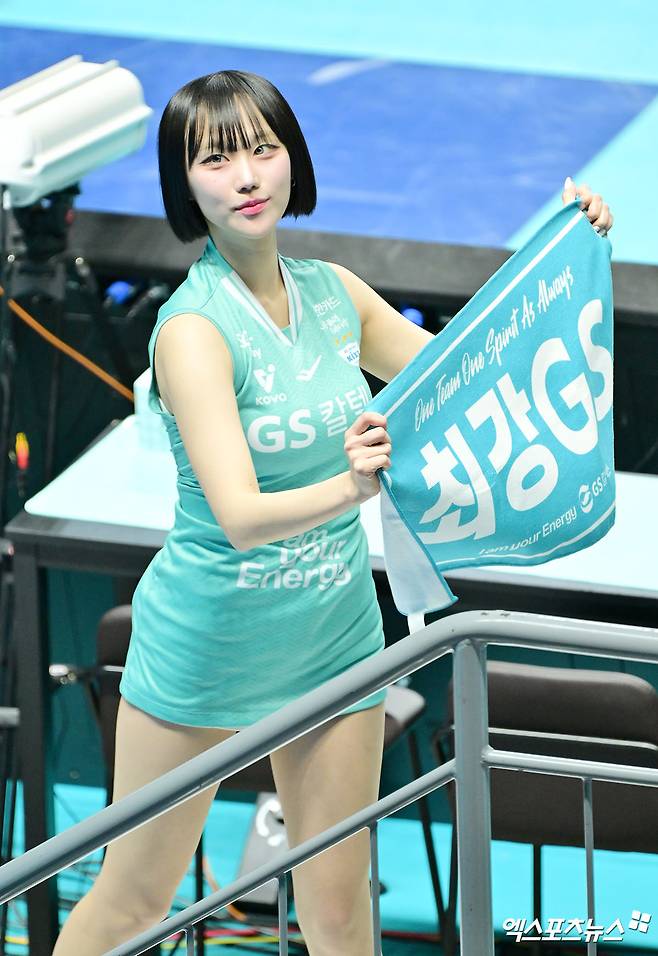 (엑스포츠뉴스 장충, 김한준 기자) 8일 오후 서울 장충체육관에서 열린 ‘도드람 2024-2025 V-리그’ GS칼텍스와 IBK 기업은행의 경기, 백지혜 치어리더가 열띤 응원을 선보이고 있다.