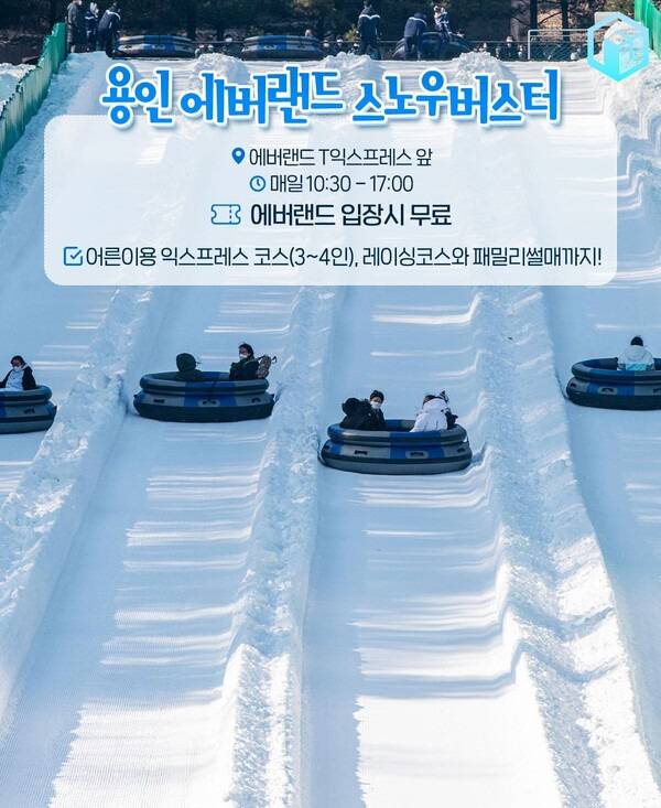 매년 겨울 개장하는 에버랜드 눈썰매장 스노우버스터입니다. 에버랜드 눈썰매장은 3가지 슬로프로 구분되어 있는데요. 어린이도 즐길 수 있는 패밀리코스, 1인 단독 탑승인 레이싱코스, 3~4인이 탑승하는 익스프레스 코스입니다.