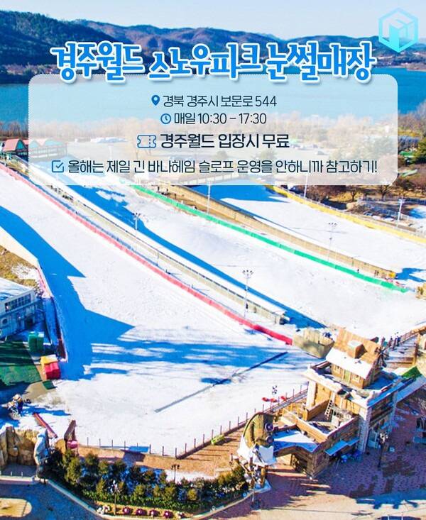 경상 지역 눈썰매장 중 성인들도 즐길 수 있는 경주월드 눈썰매장입니다. 총 3개의 슬로프로 구성되어 있으나 가장 긴 길이의 바나헤임 슬로프는 2025년 신규 어트랙션 공사로 인해 휴장하는 점이 아쉬운데요.