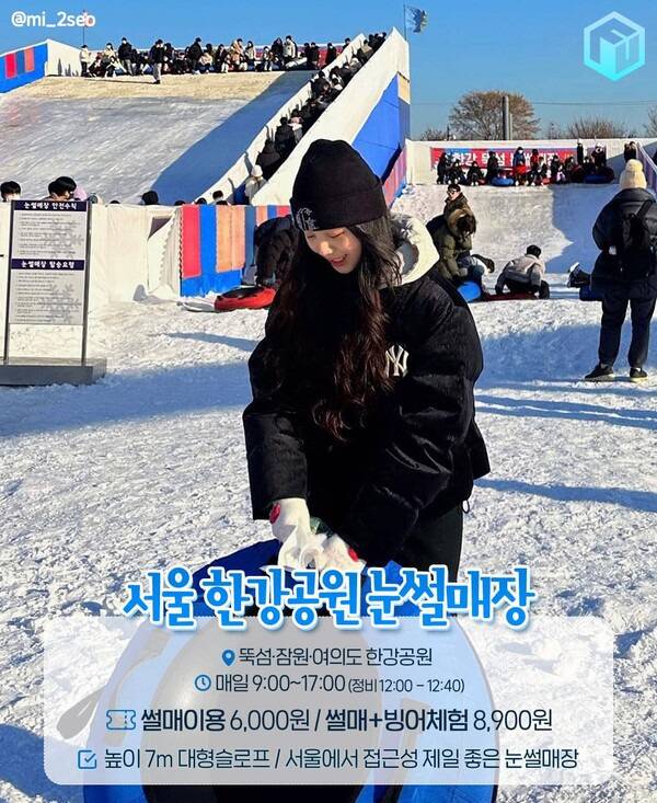서울 도심 한복판에서 눈썰매를 즐길 수 있는 한강공원 눈썰매장입니다. 2025년 한강공원 눈썰매장은 뚝섬, 잠원, 여의도 한강공원 총 3곳에서 운영되며 대형스로프와 소형슬로프 2개로 구분되어 있는데요. 최고 높이 7m의 대형 슬로프는 출발 지점에서 아찔한 높이감을 경험할 수 있으며 6세 이상부터 이용이 가능합니다.