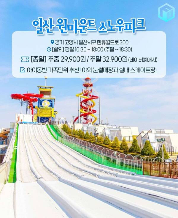 도심 속 야외 눈썰매장과 실내 아이스링크장이 있는 일산 원마운트 스노우파크입니다. 어린이를 동반한 가족단위 방문객이 많아 성인들끼리 방문하면 자유롭게 공간을 누비기엔 제약이 많을 수 있습니다. 수도권에 위치한 눈썰매장 중 비교적 가파른 경사의 110m 눈썰매장이 조성되어 있어 조심스레 추천하는 성인 눈썰매장입니다.