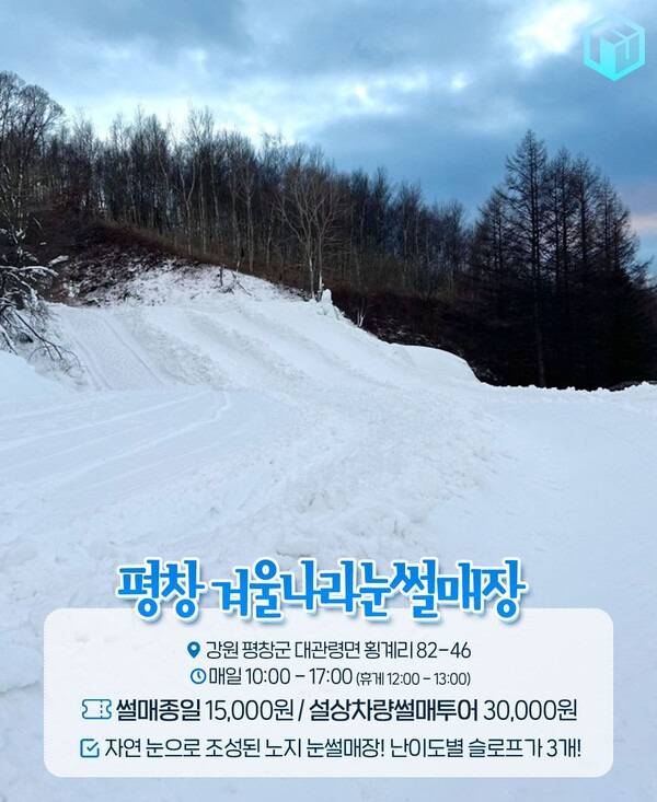 국내에서 거의 유일하게 자연 눈으로만 운영되는 노지 썰매장입니다. 슬로프는 총 3개로, 넓은 언덕을 개조한 눈썰매장인만큼 내년 슬로프의 구성이 달라지는데요. 2025년에는 이름을 바꿔 '겨울나라 눈썰매장'으로 운영하며, 현장 예매만 가능합니다.,