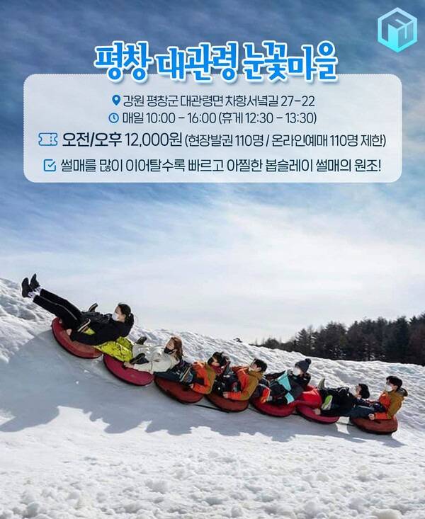 SNS에서 봅슬레이 눈썰매로 유명해진 평창 대관령 눈꽃마을입니다. 굽이진 눈썰매 트랙을 빠르게 내려가는 봅슬레이 눈썰매는 다른 곳에서는 느끼기 힘든 짜릿함을 느낄 수 있는데요. 인기가 높아지며 안전을 위해 매일 오전과 오후 입장을 구분하고 있으며 현장 110명, 온라인발권 110명으로 인원을 제한해 운영하고 있습니다.